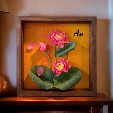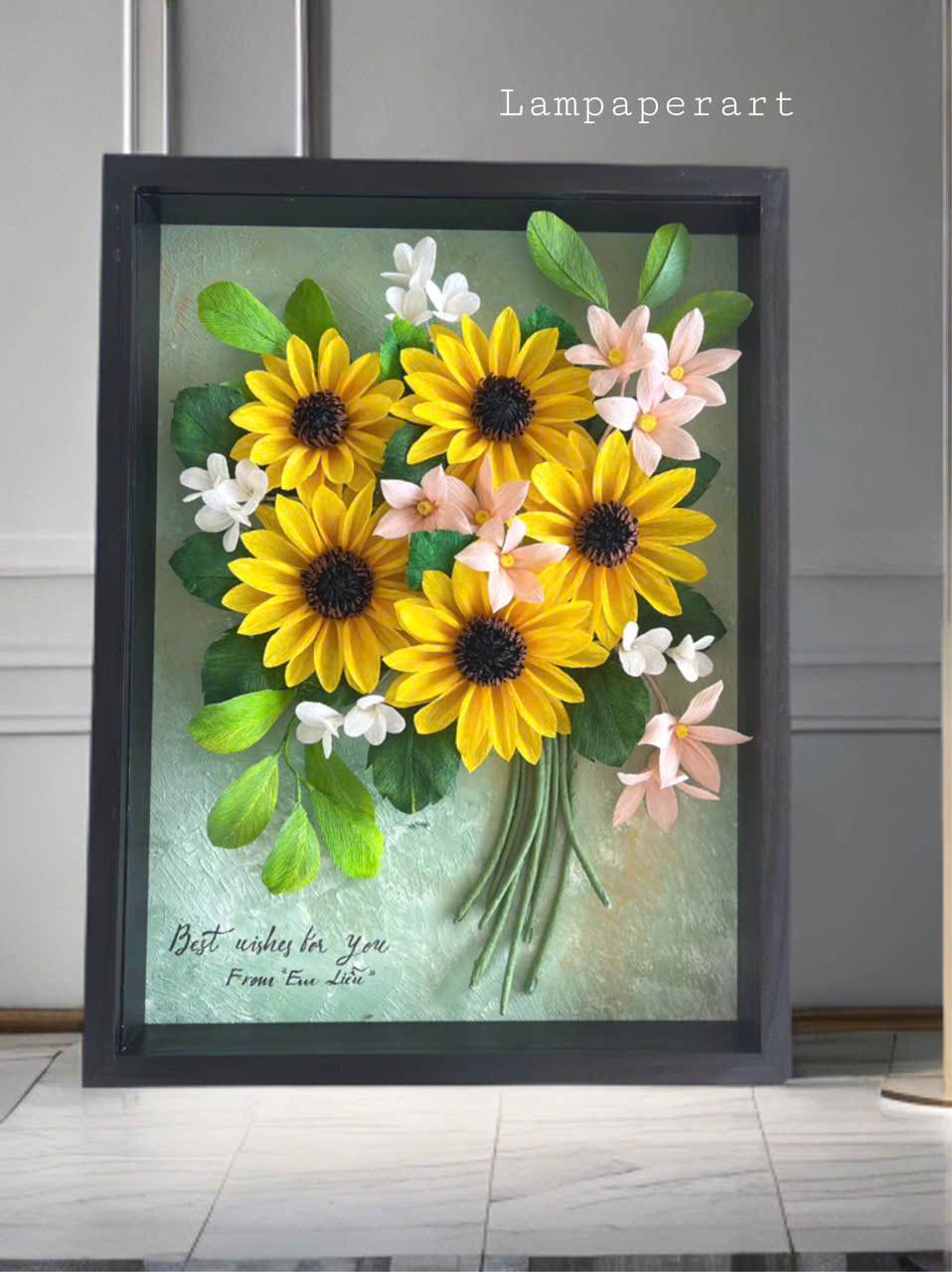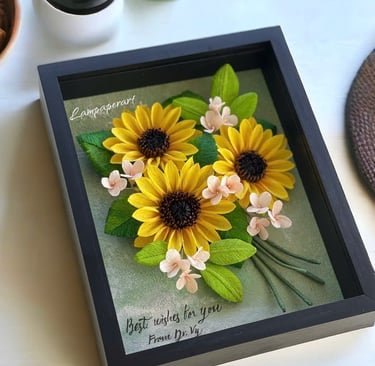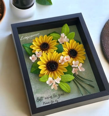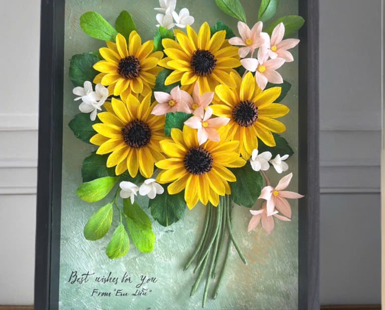 "Lấy cảm hứng từ sự vươn mình rạng rỡ của đóa hướng dương dưới nắng mai, tác phẩm Khởi Sắc là lời chúc về một sự bắt đầu mới đầy hy vọng và thuận lợi. Những cánh hoa vàng rực rỡ được chế tác tỉ mỉ từ giấy crepe nghệ thuật, đặt trong khung gỗ sâu 4.5cm tạo hiệu ứng thị giác 3D sống động.